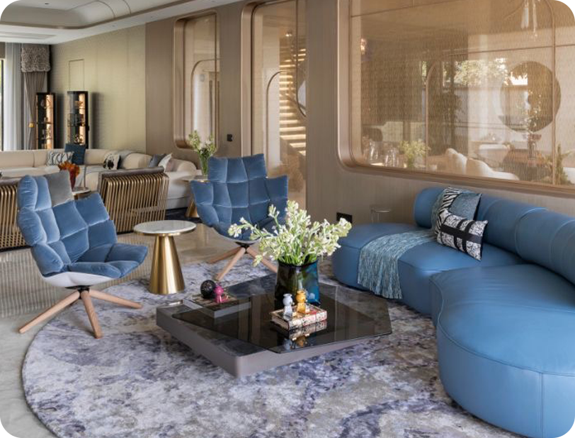 The interiors unfold as a unified experience, where ornamental elements, textured surfaces, and bespoke detailing create a sense of grandeur without excess. Each space flows seamlessly into the next, maintaining a balance between opulence and comfort.